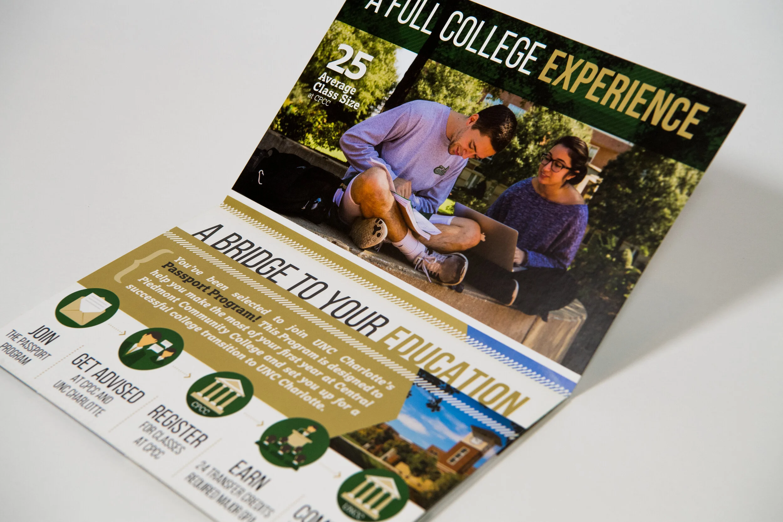 Project Description: This 3 panel foldout brochure was designed for students admitted into the passport bridge program. This program admits students to central piedmont community college for 1 year and then enrolls them at UNC Charlotte after that first year. I coordinated photo shoots of current students in the program and added personal testimonials to the brochure design. You’ll find an additional 8.5”x11 handout that contains FAQs for newly admitted passport students.